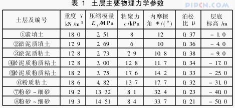 某工程主体地上8层,地下室2层,地下室基坑开挖深度最深达-16. 80 m,基坑平面尺寸约为80 m×57 m,基坑大致呈矩形。该场地在施工前曾为大面积池塘,后经人工填土整平,土质软弱,土层含水量较高,属于典型的软土,场地各土层主要物理力学参数如表1所示,开挖土层大部分为淤泥质土,透水性差,因此可能在开挖中发生较大变形。