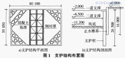 综合考虑安全、经济、对周边环境影响、施工便利这四个因素,本工程基坑设计采用钻孔灌注桩加两道内支撑作为支护结构,钻孔灌注桩桩长26. 5 m,桩径1. 1 m,间距1. 3 m,外侧设置双轴深层搅拌桩止水帷幕,直径0. 7 m,间距1 m,深16 m。支护桩内支撑采用混凝土桁架支撑和钢管支撑两种形式,上下两道支撑顶面标高分别为-2. 0 m和-6. 5 m,第一道支撑在基坑四个角部采用混凝土桁架形式,主撑截面为700 mm×700 mm,联系梁截面为700 mm×500 mm,围檩截面为600 mm×800 mm;第一道中部支撑及第二道支撑均采用双钢管支撑,截面为2609 mm×16 mm;在围护桩顶设置圈梁,截面为1 100 mm×800 mm,混凝土支撑及围檩的强度为C30。