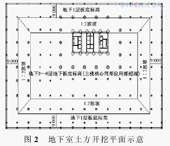3)待地下1层逆作区域梁板结构混凝土达到设计强度后,基坑中心顺作区土方开挖至地下2层,板底标高-10.100m,主楼核心筒部位开挖至-11.100m,周边逆作区与中心顺作区采用1∶2留土放坡,浇筑中部顺作区域基础底板,同时施工逆作区域地下1层结构梁板。