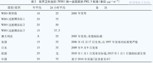 1997 年,美国率先开始监测PM2. 5 并制定相关标准,在这之后,许多国家陆续监测PM2. 5。世界卫生组织( WHO) 于2005 年制定了PM2. 5 的准则值[4]。详见表2。
