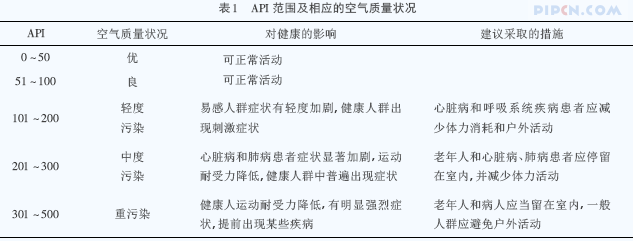空气污染指数( 英文全称为air pollution index,简称API) 就是根据环境空气质量标准和各项污染物对人体健康、生态、环境的影响,将常规监测的几种空气污染物浓度简化成为单一的概念性指数值形式,它将空气污染程度和空气质量状况分级表示,适合于表示城市的短期空气质量状况和变化趋势。空气污染的污染物主要有烟尘、悬浮颗粒物、一氧化碳、二氧化硫、二氧化氮、臭氧以及挥发性有机化合物等。目前,我国规定空气质量报告中必须监测的污染物有3 项: 二氧化硫、二氧化氮、可吸入颗粒物。API 的取值范围定为0 ~ 500,并分为5级,依次对应0 ~ 50、51 ~ 100、101 ~ 200、201 ~ 300、300 ~ 500,详见表1。(参考《建筑中文网》)