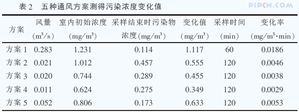 采取五种不同的通风方案(见表1),同时采用室内空气现场甲醛测定仪GDYK-206S 测得污染物的浓度(见表2)。