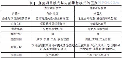 作为建筑企业常见的两种项目运营模式,直营项目与内部承包的区别如表1 所示。