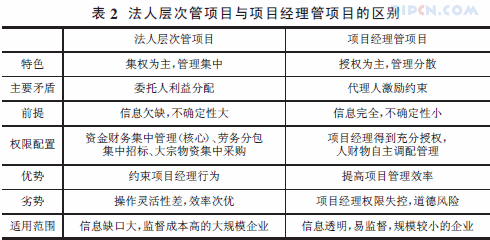 3.2.1 转变项目管理手段较之完全授权的理想模式,通过回收项目部的部分经营自主权这一次优选择,可有效避免项目经理滥用权力,减少监督成本和代理成本。当前,各类可操作性、适应性较强的全新项目管理手段在建筑企业中得以发展,“法人层次管项目”是其一,表2 给出了它与传统的项目经理管项目的主要区别。这是由项目经理承包制这一当前模式向项目经理责任制这一理想模式完美转换的过渡模式。