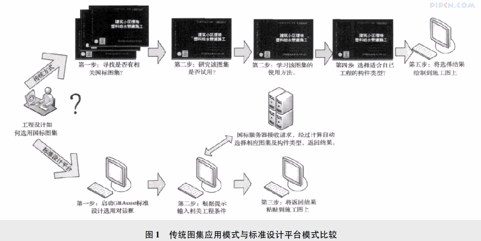过去工程设计人员使用标准图集的模式是“图集选用”的模式,首先要去寻找是否有正在做的工程相关的国标图集,找到相关图集后,要具体了解该图集,学习掌握该图集的使用方法,最后选择适合于自己工程的图集及选择合适的节点类型。这种选用模式要求设计人员平时很注意相关技术资料的收集,善于学习新东西。而目前很多设计人员忙于工程设计任务,常常忽视技术积累,因此这种模式很大程度上影响了国标图集的推广使用。很多很实用的图集,连我们自己院的设计人员都不了解。标准设计电子化研究的课题就是要改变这种传统的“图集选用”模式,引入“标准设计”模式,通过建立标准设计应用服务平台,将标准设计选用工具放在工程设计人员的电脑桌面,与工程师平时使用的设计平台紧密结合。设计人员在使用标准图时,不需要事先了解、学习、掌握大量的标准图集信息,只需用鼠标点击菜单,打开标准设计选用对话框,输入相关工程条件既可获得准确的选用结果,粘贴到自己的工程图纸上既可。