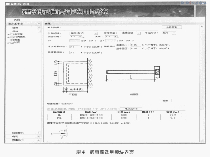 点击“标准设计选用”菜单后出现标准设计选用平台界面。标准设计平台以桌面应用程序对话框形式出现。系统淡化了“图集选用”的概念,而是根据工程设计习惯,以面向设计对象的形式出现。专业设计人员可以通过左侧树形目录,直接选择相应的专业及相应的构件,然后根据页面提示的数据录入对话框输入相关工程信息既可检索到满意的结果。