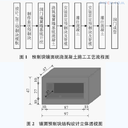 在端翼墙式洞门墙体施工时,用事先预制好的盒状预制块砌放在墙体表层,预制块既是现浇混凝土的镶面层,又是现浇混凝土的模板,砌放一层预制块浇筑一层混凝土,直到设计高度。盒状预制块既能减轻预制块的重量,便于搬运安装,又能与现浇混凝土镶嵌牢固。