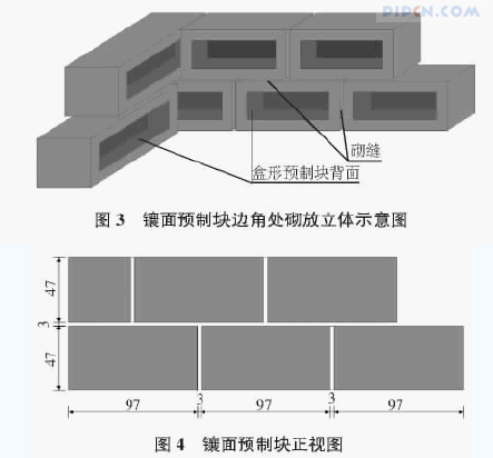 当端翼墙基底混凝土达到设计强度的50% 即可砌筑安装第一层预制块,要求砌缝宽3 cm,砌缝砂浆强度M20,为了确保砌缝均匀不变形,可在砌缝内放置砌缝混凝土垫块。要求砌缝砂浆饱满,快凝。端翼墙背模可以采用浆砌片石或山体代替,如后背空间比较大( 有明洞) 也可用普通模板立模。预制块安装结构见图3,图4。