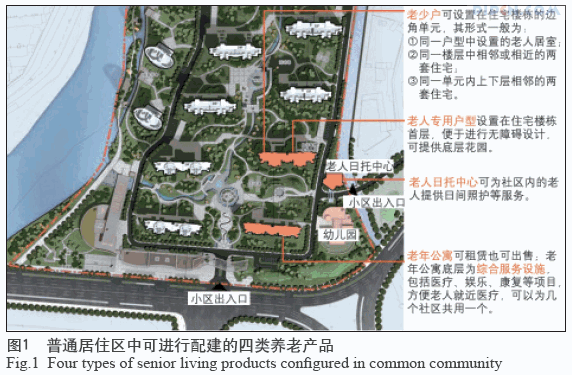 这种配建式的养老社区是指在普通居住区中加入老年人居住组团、楼栋或套型,以及一些适老化的配套设施(图1)。相比于仅有老人居住的社区而言,这种“混居”社区能够让老人接触到其他年龄段的居住者,保持与外界环境的接触,同时老人还可以与自己的子女或亲友邻近居住在同一个社区中,便于相互照顾。