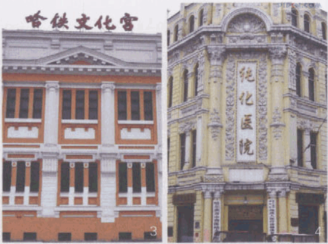 道外纯化医院,原同义庆百货商店,1916年由我国建筑师借鉴巴洛克式建筑风格并与中国民间图案花饰融为一体建造而成的“中华巴洛克”建筑,是哈尔滨中西方文化交融的特殊产物,属于哈尔滨市Ⅱ类保护建筑。该栋建筑采用了大量不同形式的壁柱,柱子通常都不做收分,柱头、柱身和柱础上布满了复杂精美的中国传统装饰性浮雕图案。建筑的主入口两侧分立着一对西式爱奥尼柱头与中式鼓座式柱础相结合的双倚柱。柱头上方设置两根两层通高的装饰着中国结图案的科林斯单倚柱。在单倚柱和其支撑拱券包围的范围内,布满精雕细琢的菊花浮雕。建筑立面上二层的双分矩形窗中间采用白色半圆形的窗中柱,柱身有凹槽,柱头上方装饰有同样颜色的曲线形中心锁石并以花朵的形式向两侧延伸。三层则采用了连续的双分拱窗形成韵律感,窗户中间采用了矩形的窗中柱,柱头采用简化了的爱奥尼形式。这些柱式的运用,使建筑立面简洁并富于动感,是中华巴洛克风格的典型代表。(图4)